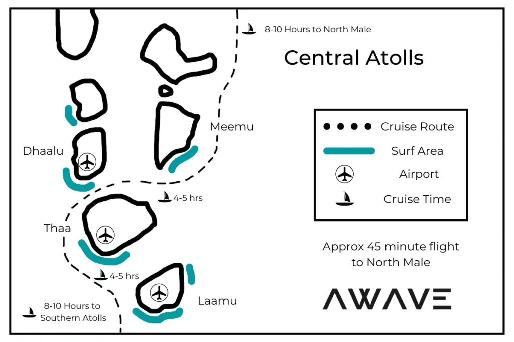 The Central Atolls follows a similar season to that of North Male, with the best waves breaking March – November. Swell usually peaks in the months of June – August, when the larger swells arrive. We recommend the Central Atolls for all levels of surf looking for adventure and quieter surf!