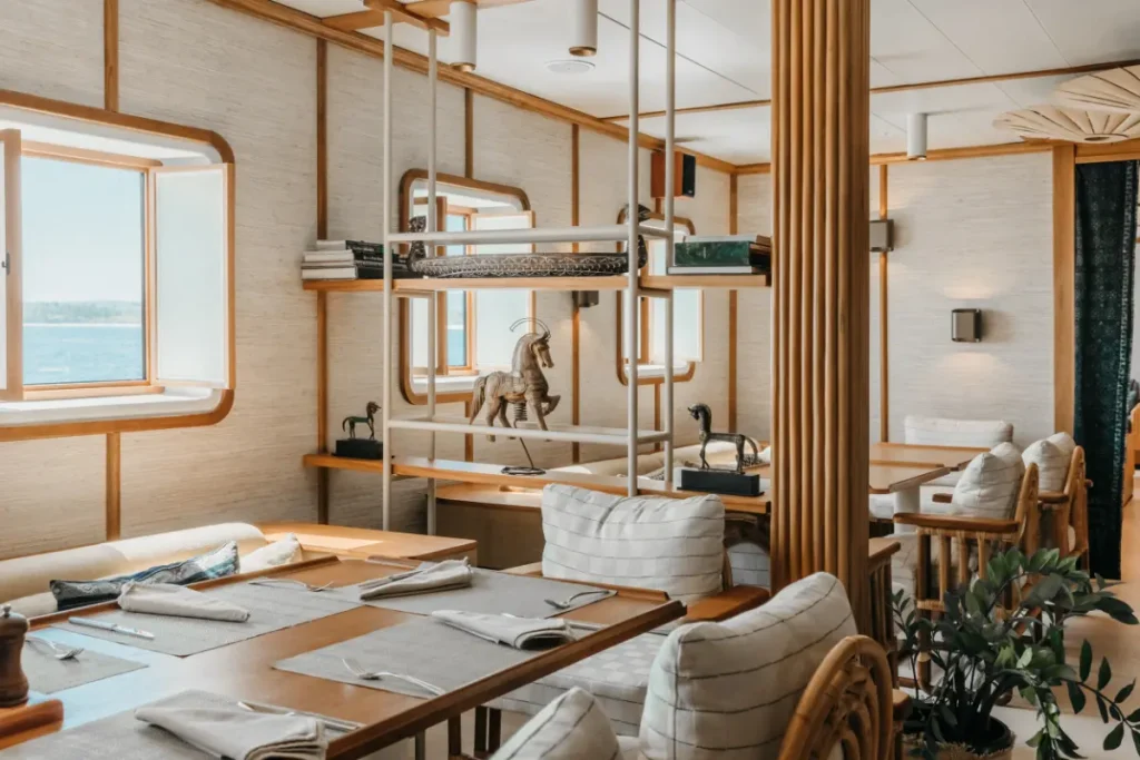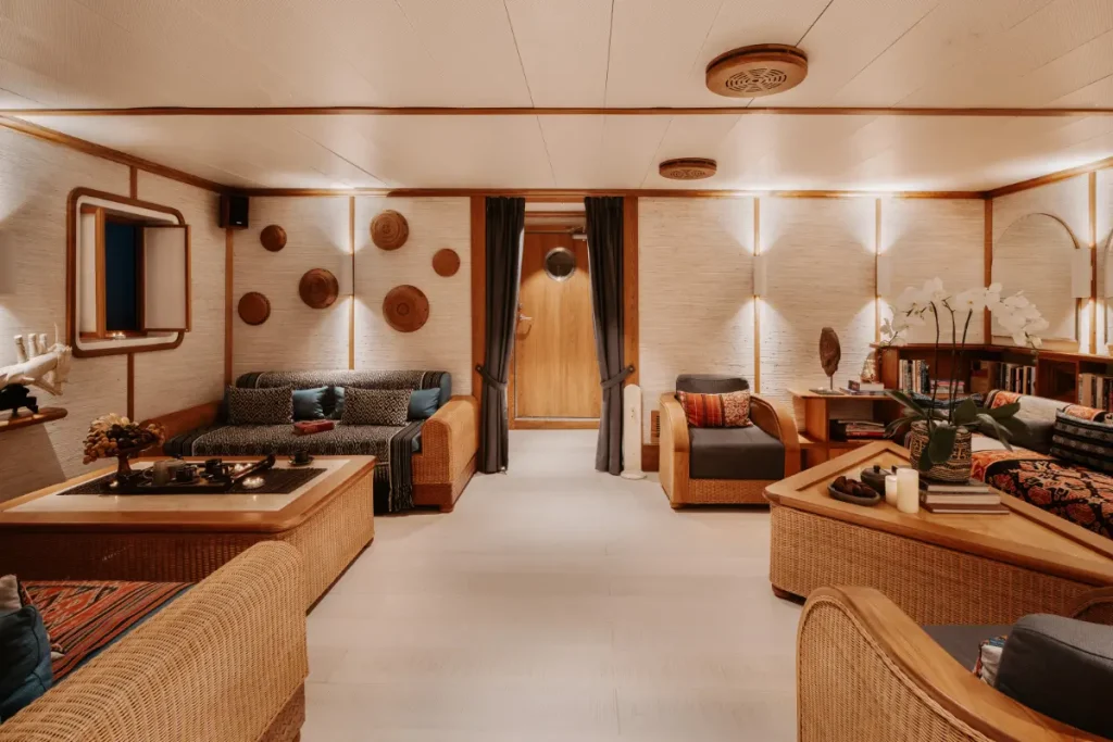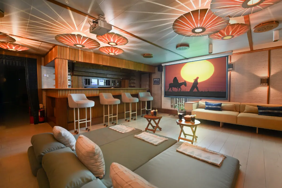 Kudanil Explorer can accommodate up to 16 travelers onboard in 8 luxury cabins. Each 15m2 bedroom comes with one king-size bed or two single beds (optional). All beds are fitted with the finest quality sheets. Additional beds are available for children upon request.