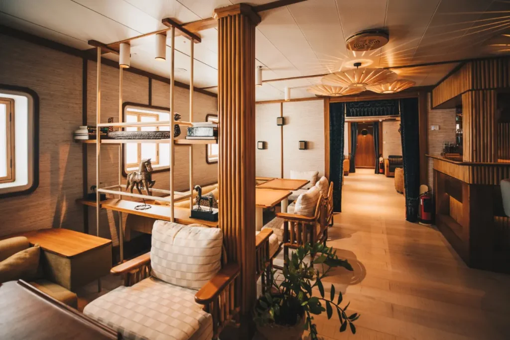 Each cabin also comes with a private en-suite 4.5 m2 bathroom, private terrace (11 m2) complete with a day bed, two chairs, and a coffee table. There’s adjustable air-conditioning and a flat screen to connect your favorite series & movies from your device.