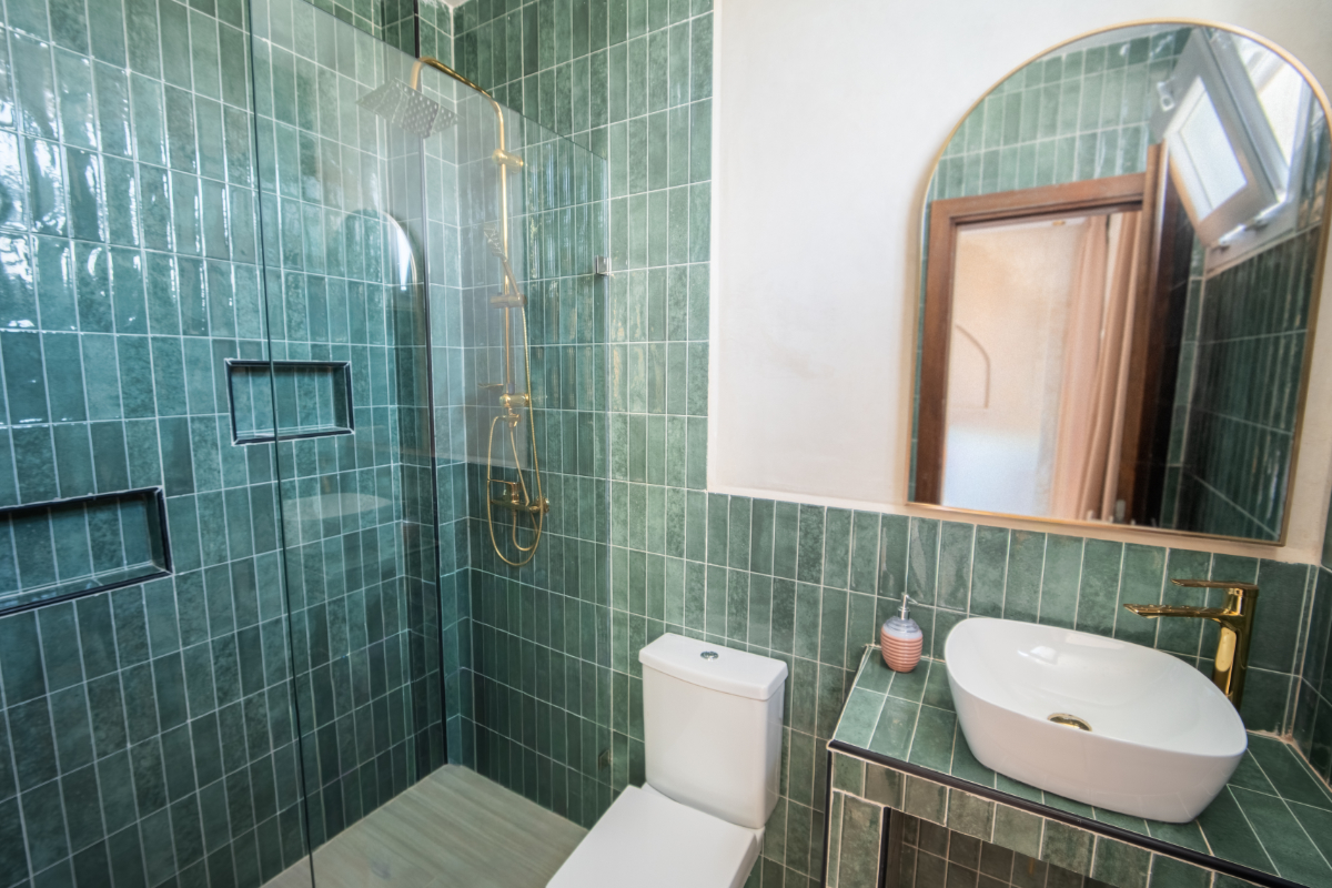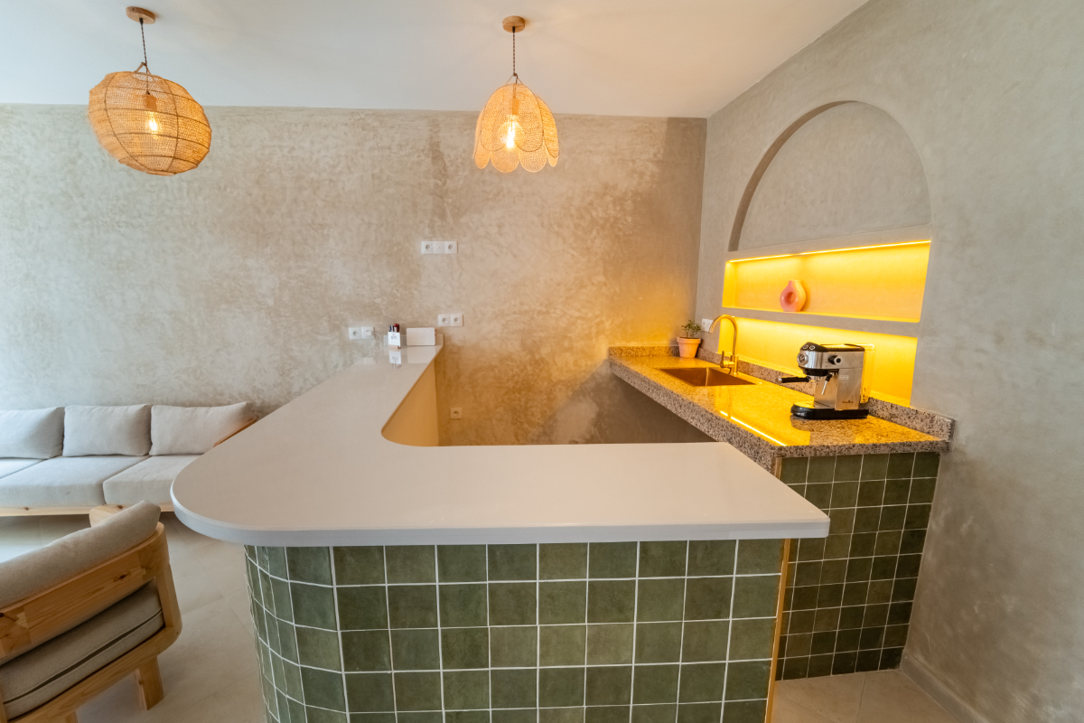 The private suites come with a queen bed, en-suite bathrooms, a little desk and storage space — clean, calm and thoughtfully designed. Throughout the house, there is a warm, minimalist style: local materials, natural textures, and lots of places to gather or escape.
