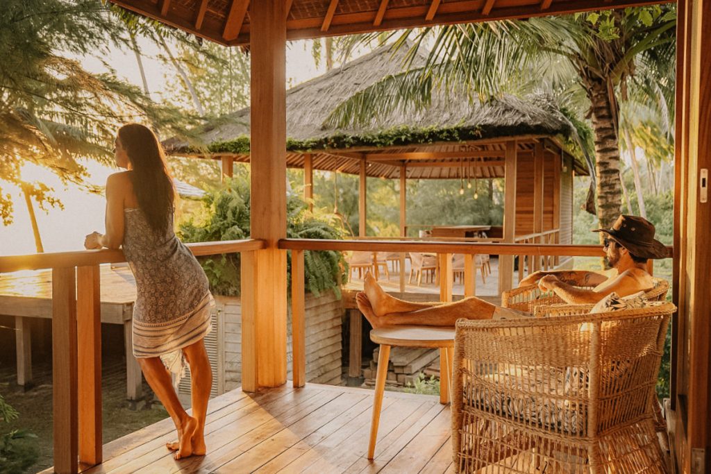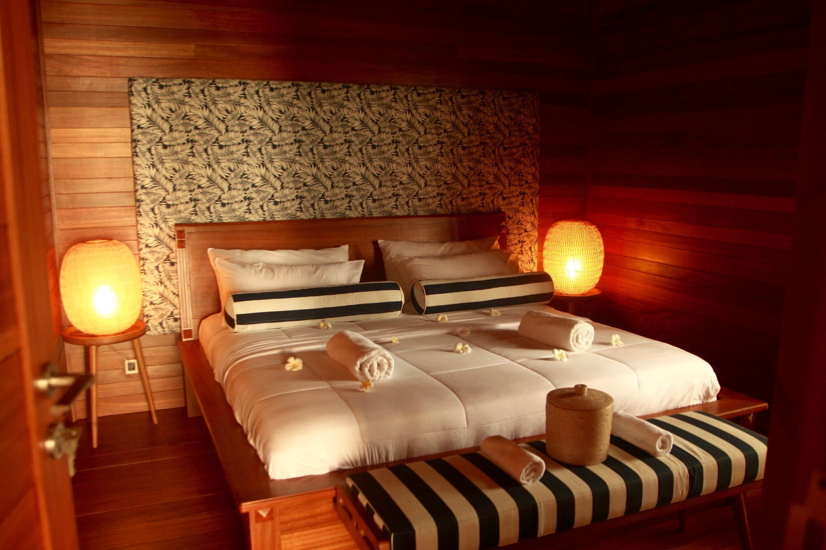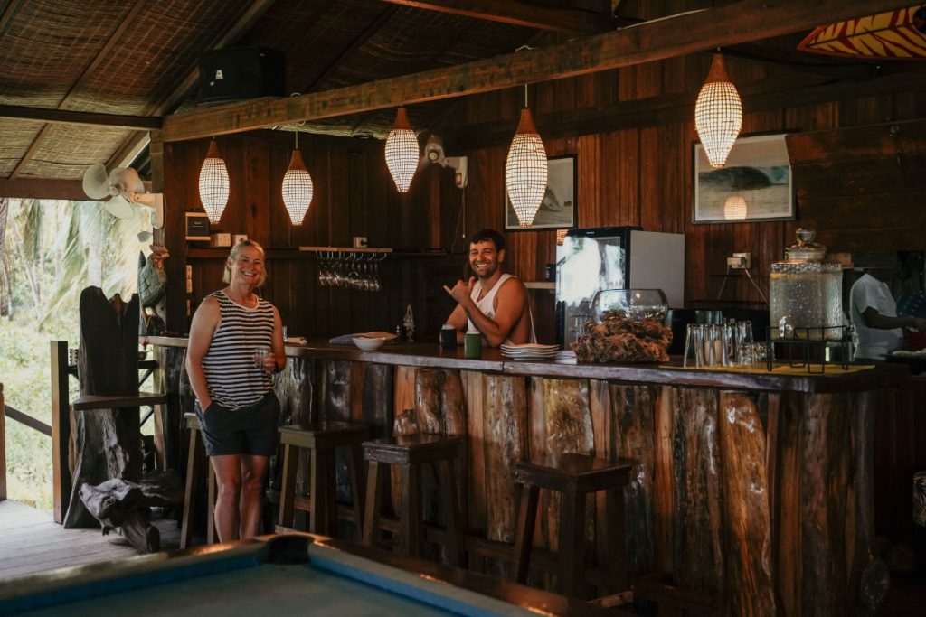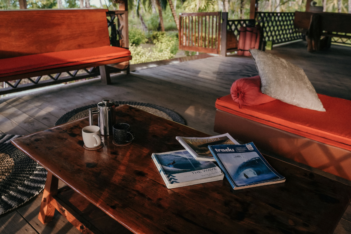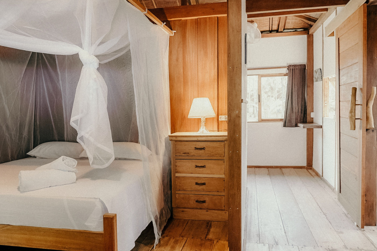 Each bungalow offers comfortable beds, mosquito nets, private bathrooms, and an open-air layout that captures the breeze and the beauty of island life. Outside, hammocks and shaded verandas provide the ideal spot to relax with a book, take a post-surf nap, or watch the sunset with a cold drink in hand.