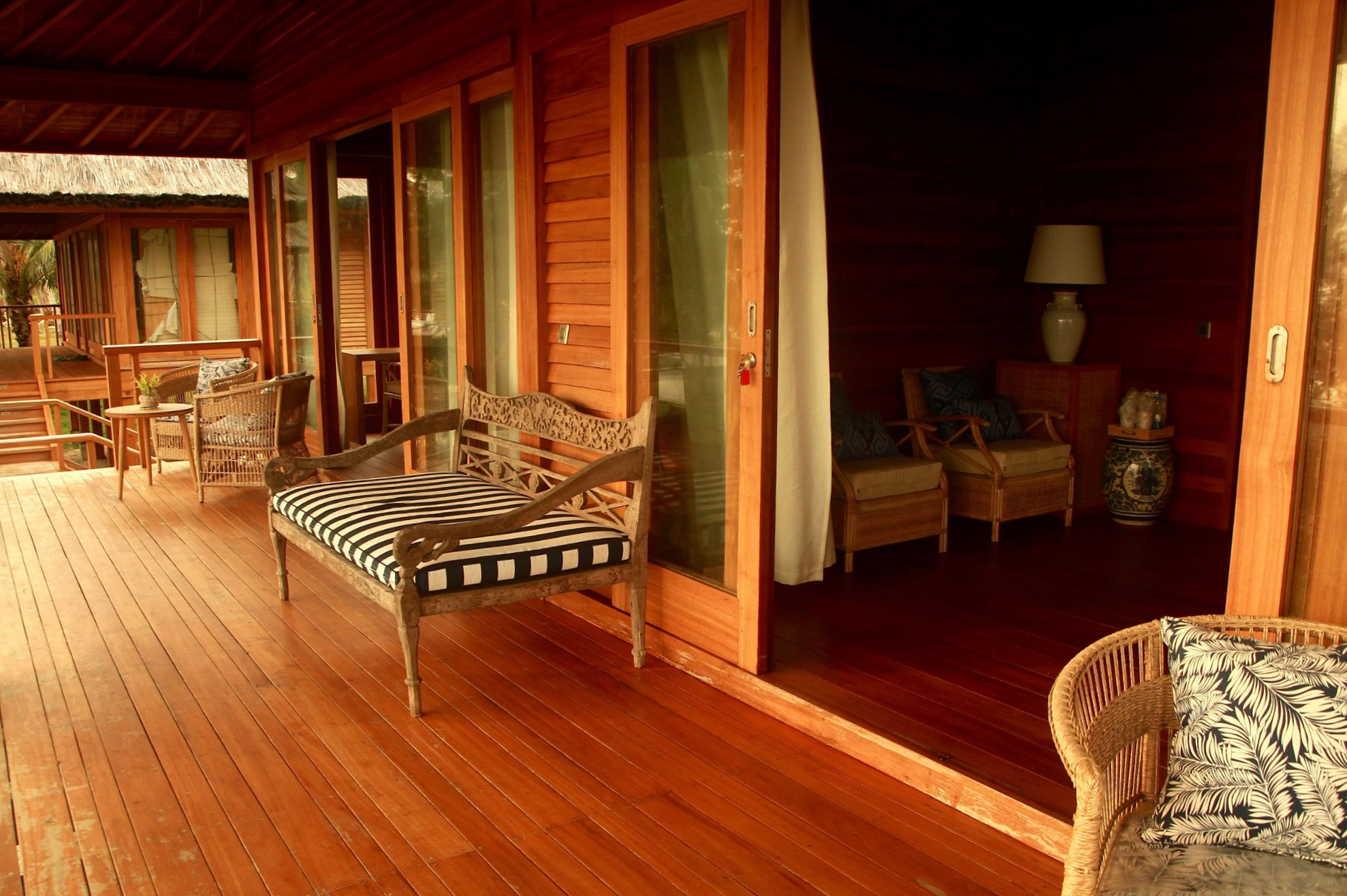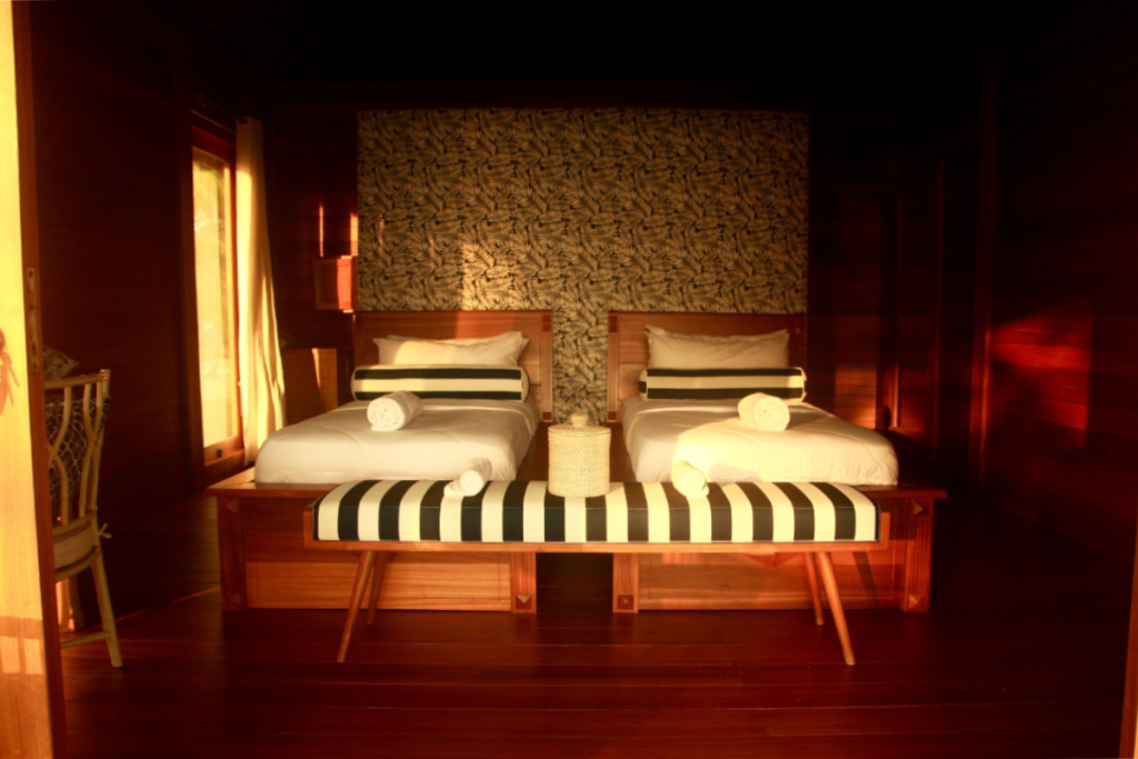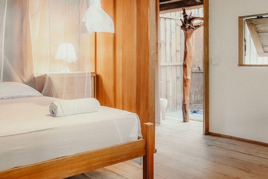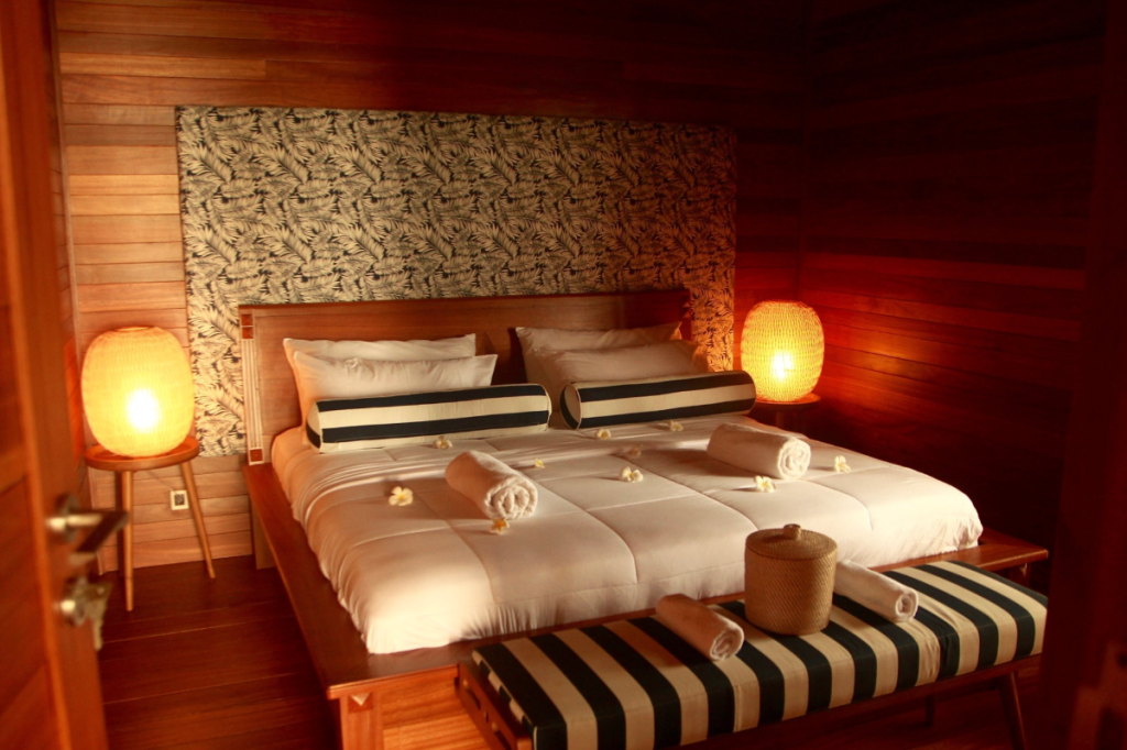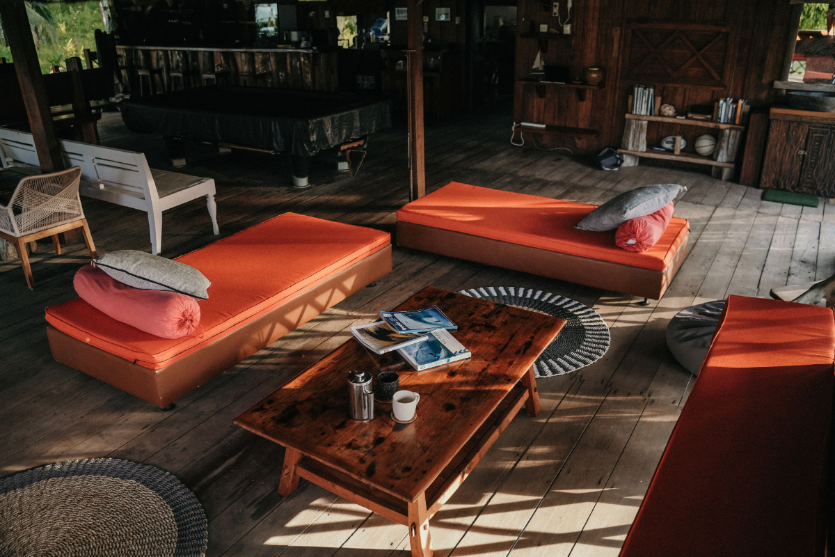 Each bungalow offers comfortable beds, mosquito nets, private bathrooms, and an open-air layout that captures the breeze and the beauty of island life. Outside, hammocks and shaded verandas provide the ideal spot to relax with a book, take a post-surf nap, or watch the sunset with a cold drink in hand.