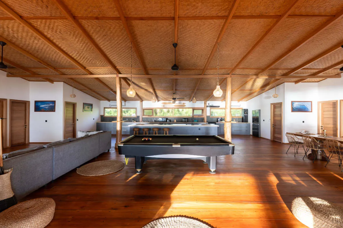 Set on powdery white sands and bordered by crystal-clear waters, the villa offers access to seven nearby waves. Its stunning interiors complement the natural beauty of the surroundings, making it an ideal retreat for groups of up to ten people.